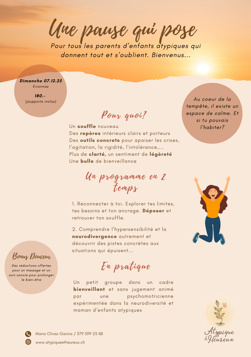 Bonus : Parce que prendre soin de soi, c’est aussi prendre soin de son enfant… A l’issue de la journée, tu recevras un petit cadeau : un bon de réduction à faire valoir chez une masseuse et pour un soin sonore.